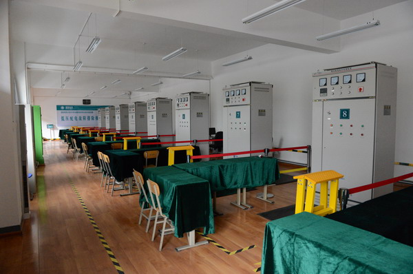 该实训室为农网运检专业个人技能项目使用场地。现场设备采用的是郑州万特电气股份有限公司提供的WT-F09C低压配电综合实训装置,共有10个工位。WT-F09C低压配电综合实训装置一次接线模拟配变台区400V辐射电网接线;具有对低压配电设备的控制回路、仪表指示测量回路、三相及单相计量回路、三级漏电保护回路、电源分接回路、电容器补偿回路及电动机控制回路的常见故障进行分析、判断、处理以及培训和考核功能;可以通过计算机智能设置、查询和取消故障。可完成相关工种人员各等级培训、技能鉴定工作及各类技术比武、竞赛等工作。